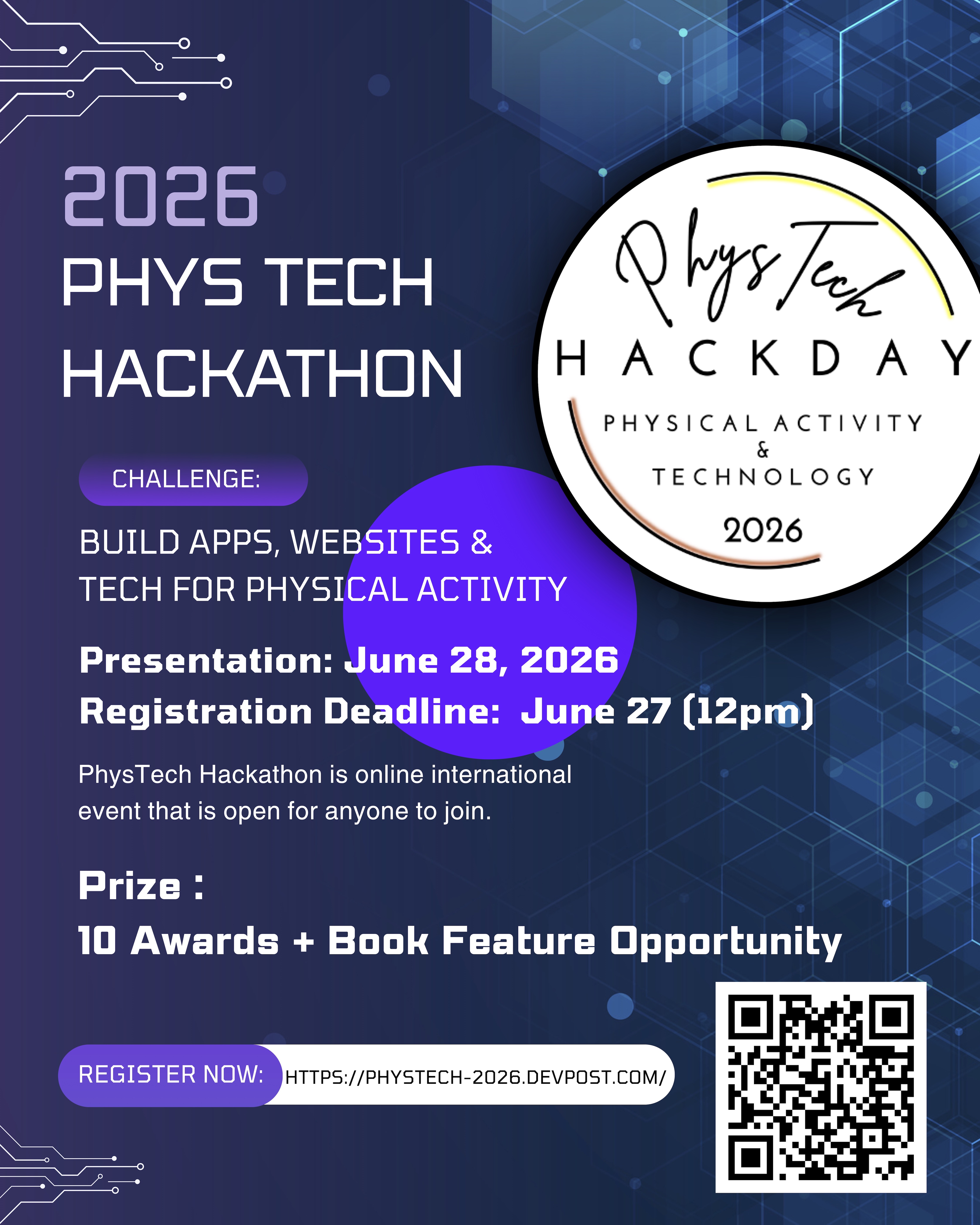 PhysTech is an online, student-led hackathon for anyone who does, watches, analyzes and promotes physical activities - including sports, workouts, fitness exercises, casual hobbies, and recreational adventures.